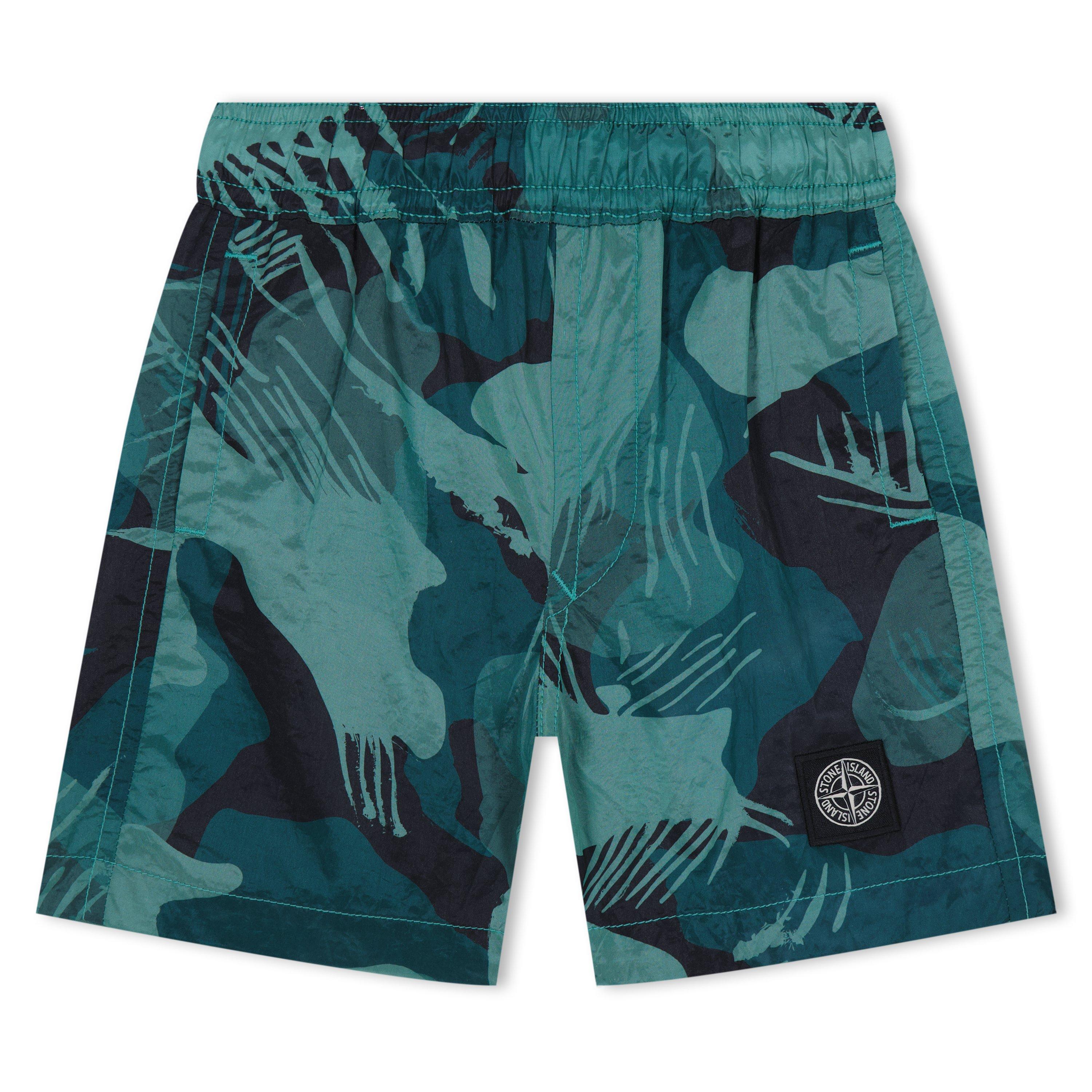 Swim trunks made in a full-print new responsible Stone Island iridescent Nylon Metal fabric. The evolution of this iconic fabric sees the use of ECONYL® regenerated yarns: the life ended nylon, pre and post-consumer, is recycled with a complex depolymerization process to create this fibre that features the same intrinsic characteristics of nylon from fossil raw material. The finished piece then undergoes an elaborate double dye procedure. All over seasonal print. On seam hand pockets. One back pocket with hidden zip fastening. Stone Island Compass patch logo on the left leg. Inner mesh. Elasticated waistband with inner drawstring.