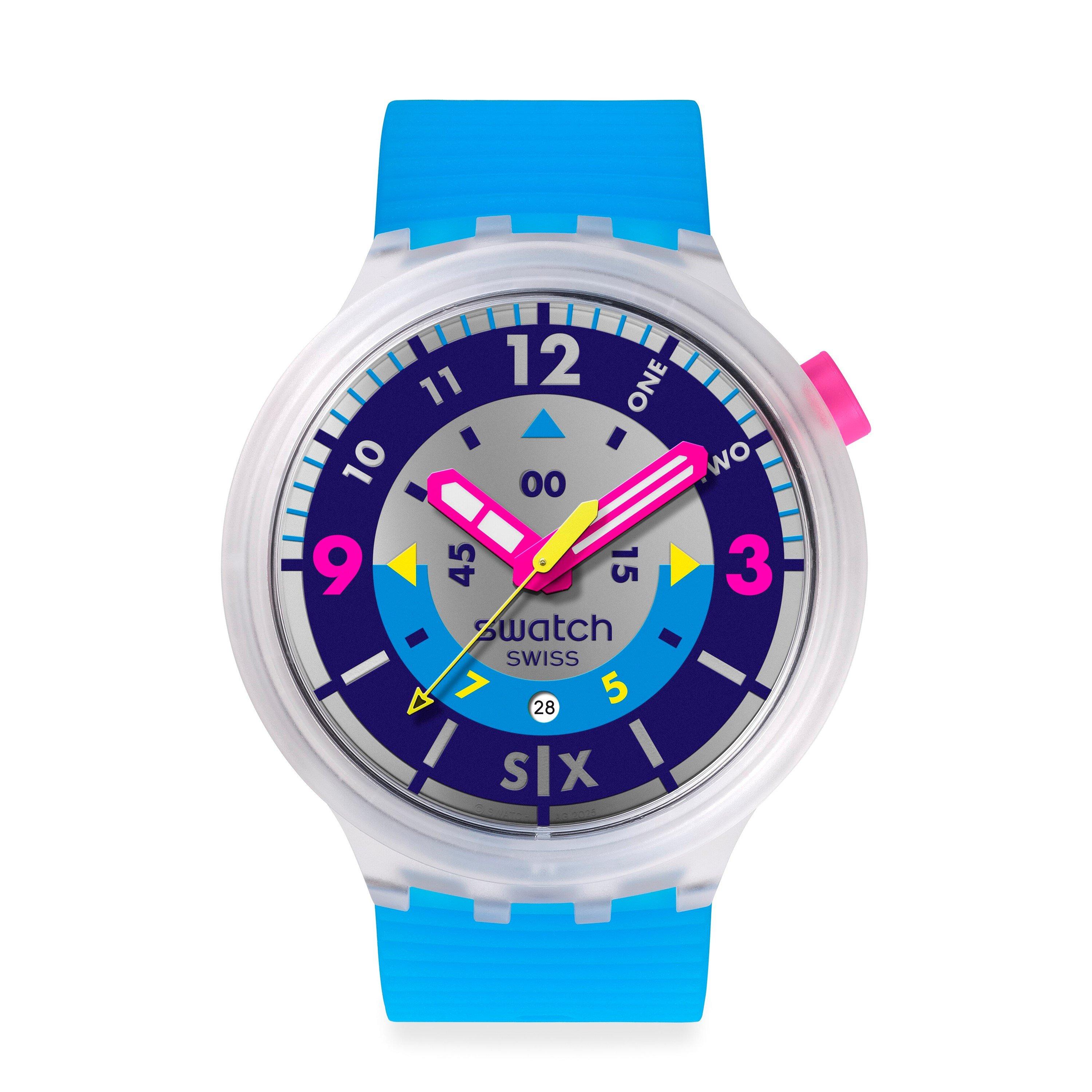 Swatch's Neon Hielo 62 Analogue Quartz Watch features contemporary timekeeping and bold design elements. The unisex adult timepiece delivers Swiss precision within a form that stands out on any wrist.