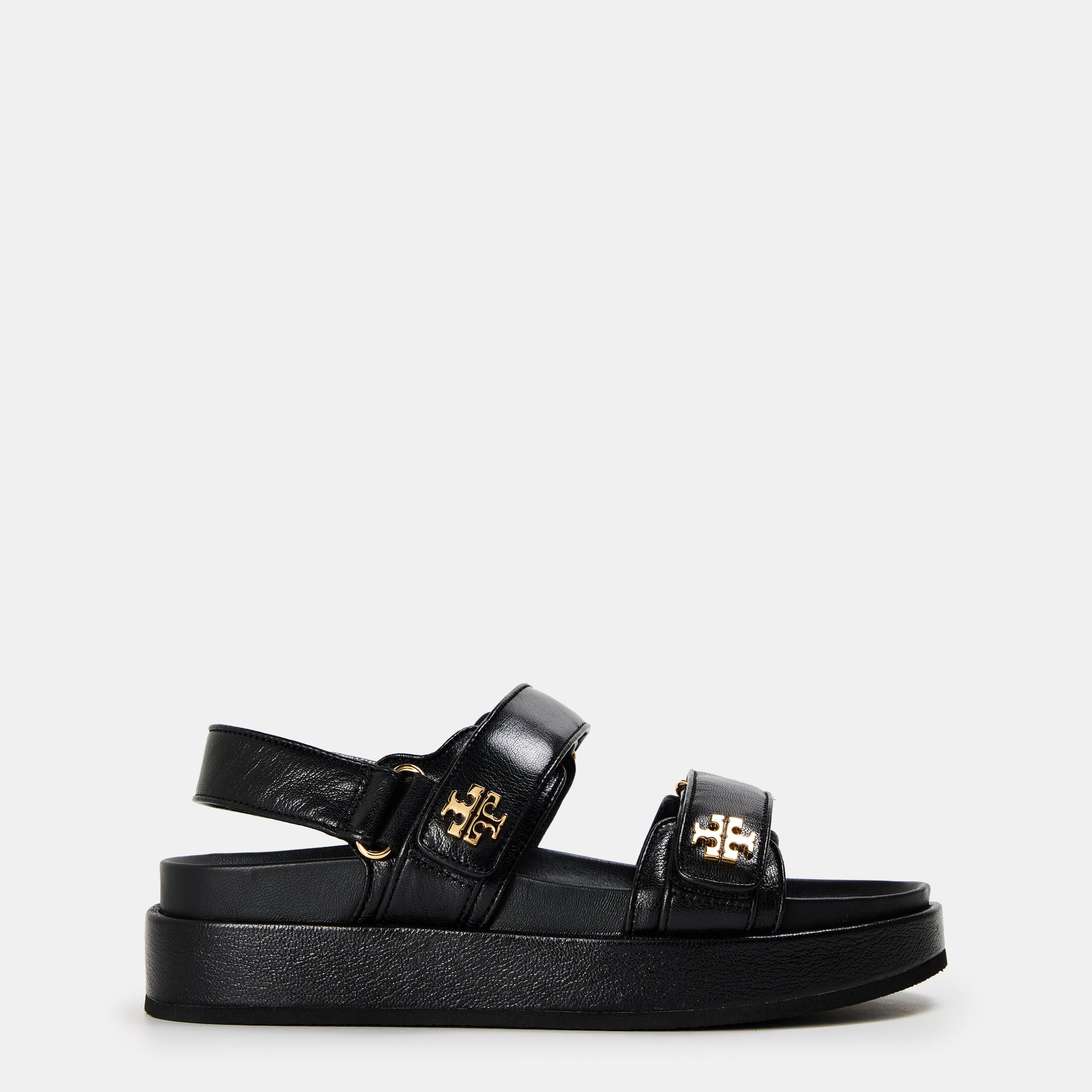 The Kira Leather Flat Sandals from designer Tory Burch feature a clean design with leather and hardware detailing.