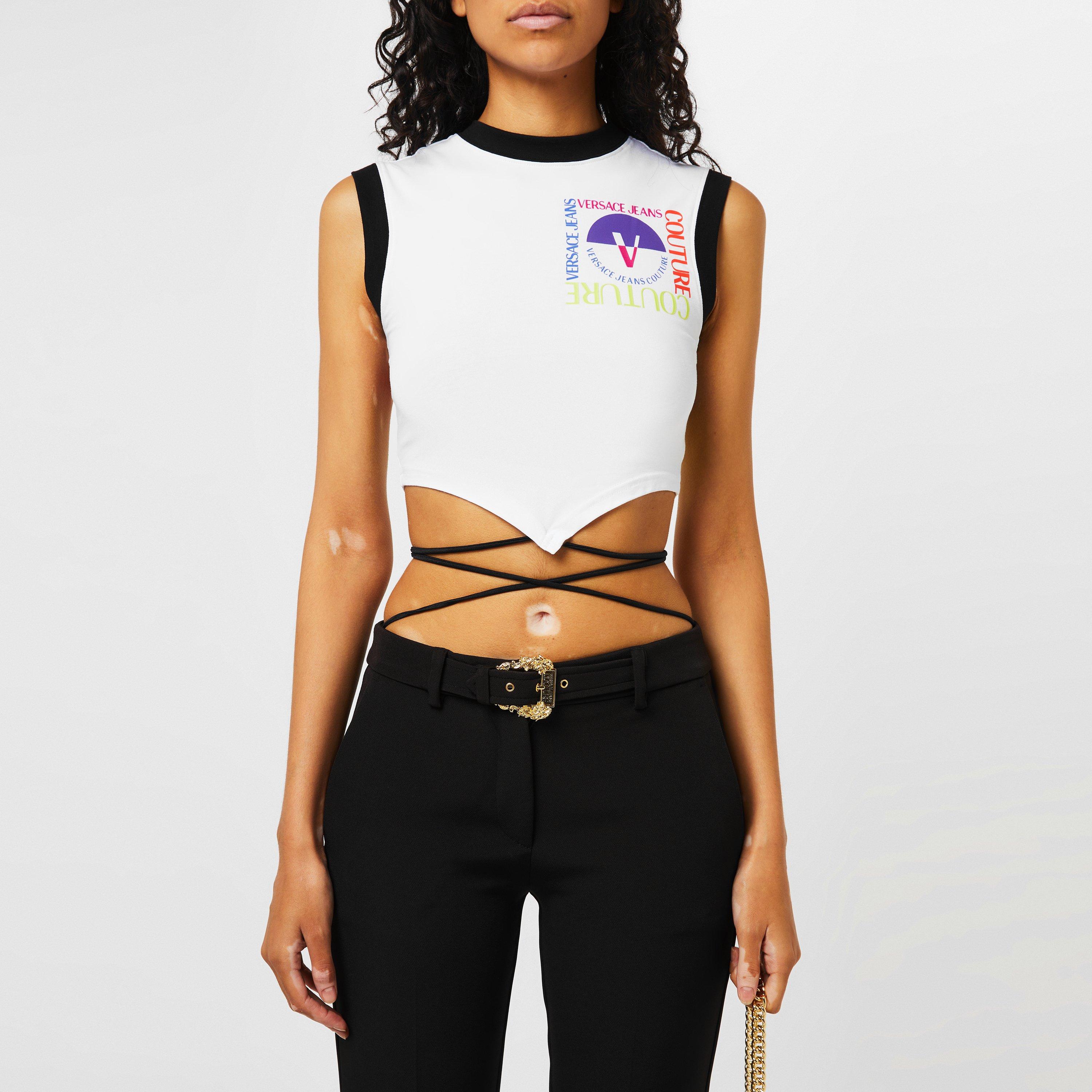 Elevate your weekend wardrobe with this Logo Crop Top from Versace Jeans Couture. Effortlessly exude elegance in this eye-catching top, expertly crafted from a stretchy, supple cotton and elastane construction creating a lightweight, sumptuous feel that is both luxurious and durable, enhancing your comfort with its breathable feel, perfect for your Saturday shopping trips. Designed in a classic colourway this look is accentuated by the rear embroidered logo print in multiple colours, achieving a vivacious appeal, especially with the print in miniature on the front achieving instant brand recognition. Offering short sleeves, a crew neck collar and a cropped hem in a contrasting colour, this look is punctuated by the rear self-tie fastening to create a cinched-in waist for a more structured edge. Pair with matching Versace Jeans Couture shorts to complete the summery ensemble. Composition: 95% cotton and 5% elastane. Machine wash according to care results