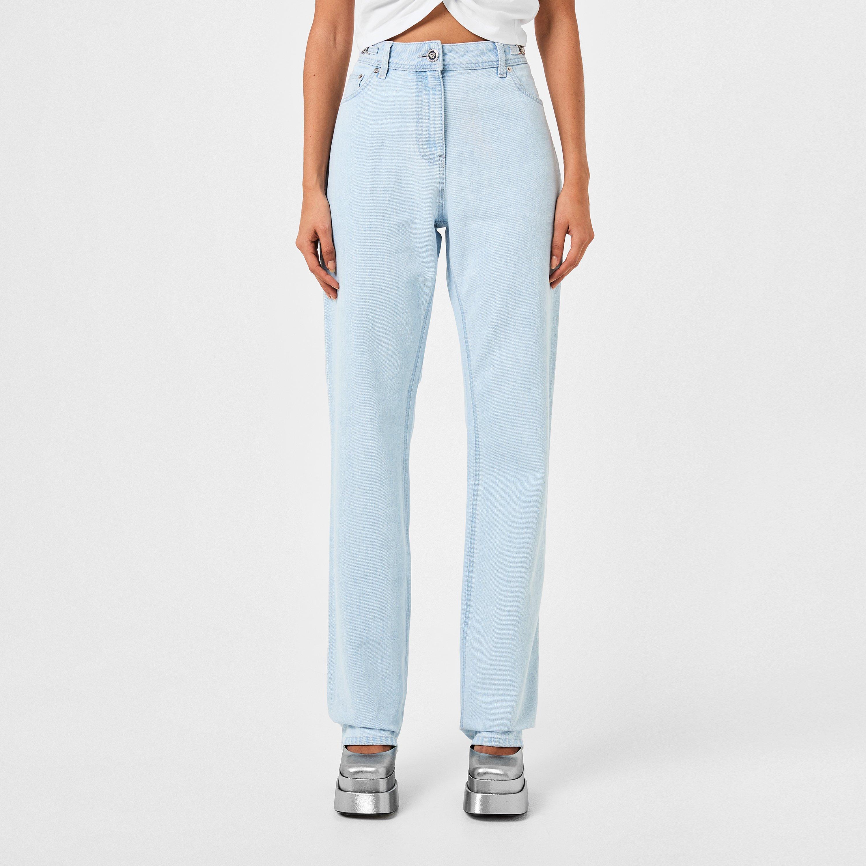 Versace's Medusa Straight Leg Jeans deliver a classic look with Medusa hardware detailing. The structured fabric features clean lines and classic proportions, accented by the Medusa hardware. The straight leg cut provides a comfortable fit suitable for both casual and dressy occasions.