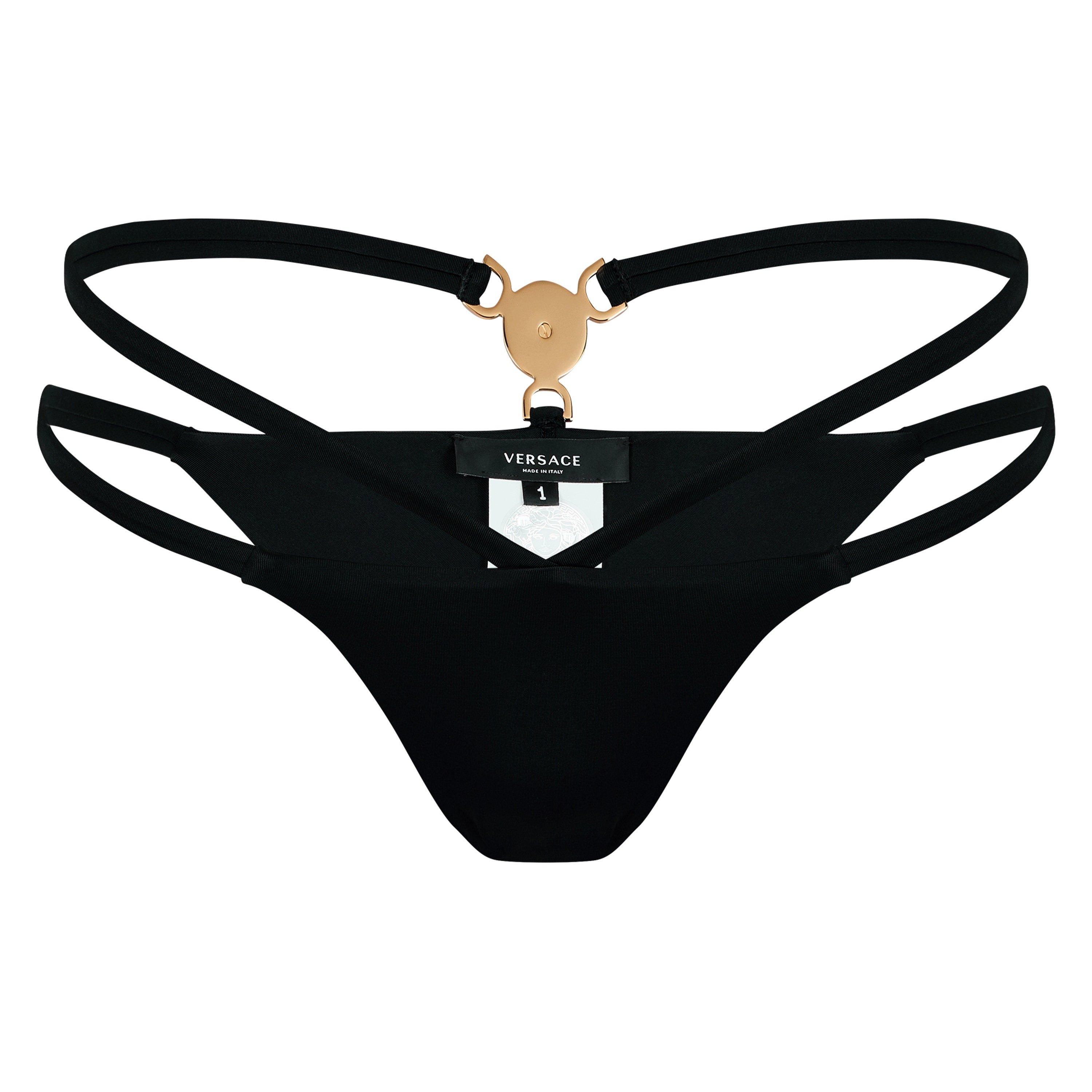 Elevate your luxury swimwear ensemble with these Medusa '95 Bikini bottoms from Versace. Expertly crafted with nylon material, these bikini bottoms provide long-lasting comfort whilst maintaining an eye-catching aesthetic. The bikini bottoms feature Brazillian cut coverage, sitting high on your hips with minimal rear coverage, creating a streamlined silhouette. These bottoms are fastened with an elastane waistband with string detailing for a sensual appeal. The design is signed off with the iconic Medusa charm on the rear of the waistband to attach the string detailing. The Medusa logo originated from Greek mythology and was known for making people fall inescapably in love with her, so was chosen by Gianni Versace to be synonymous with the designs from his luxury Italian fashion house. Composition: Outer - 78% Nylon, 22% Elastane. Lining - 88% Polyester, 12% Elastane. Follow care instructions.