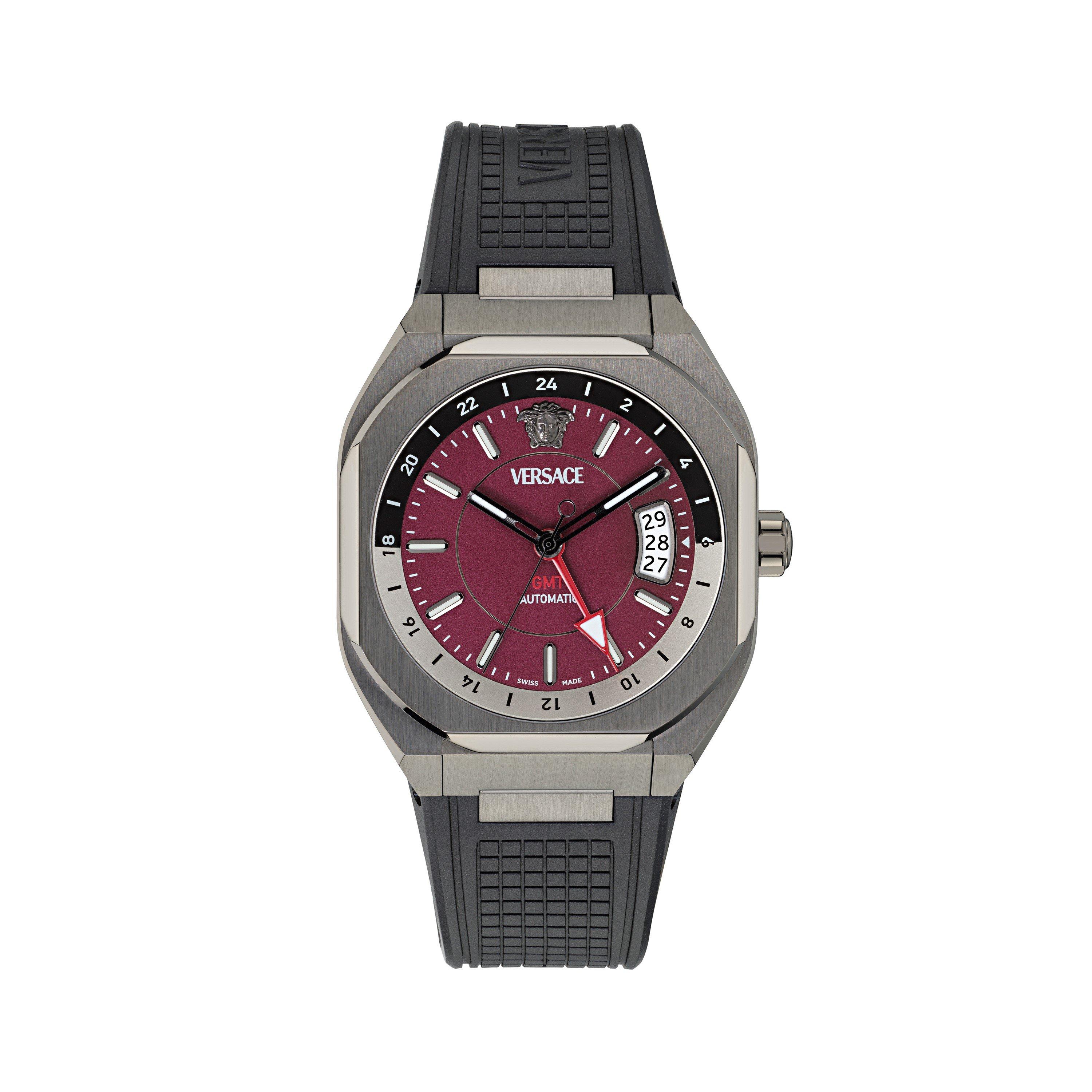 Versace's Chrono X Automatic Watch features precision engineering with a chronograph display and stainless steel case. The exhibition caseback reveals the automatic movement within.
