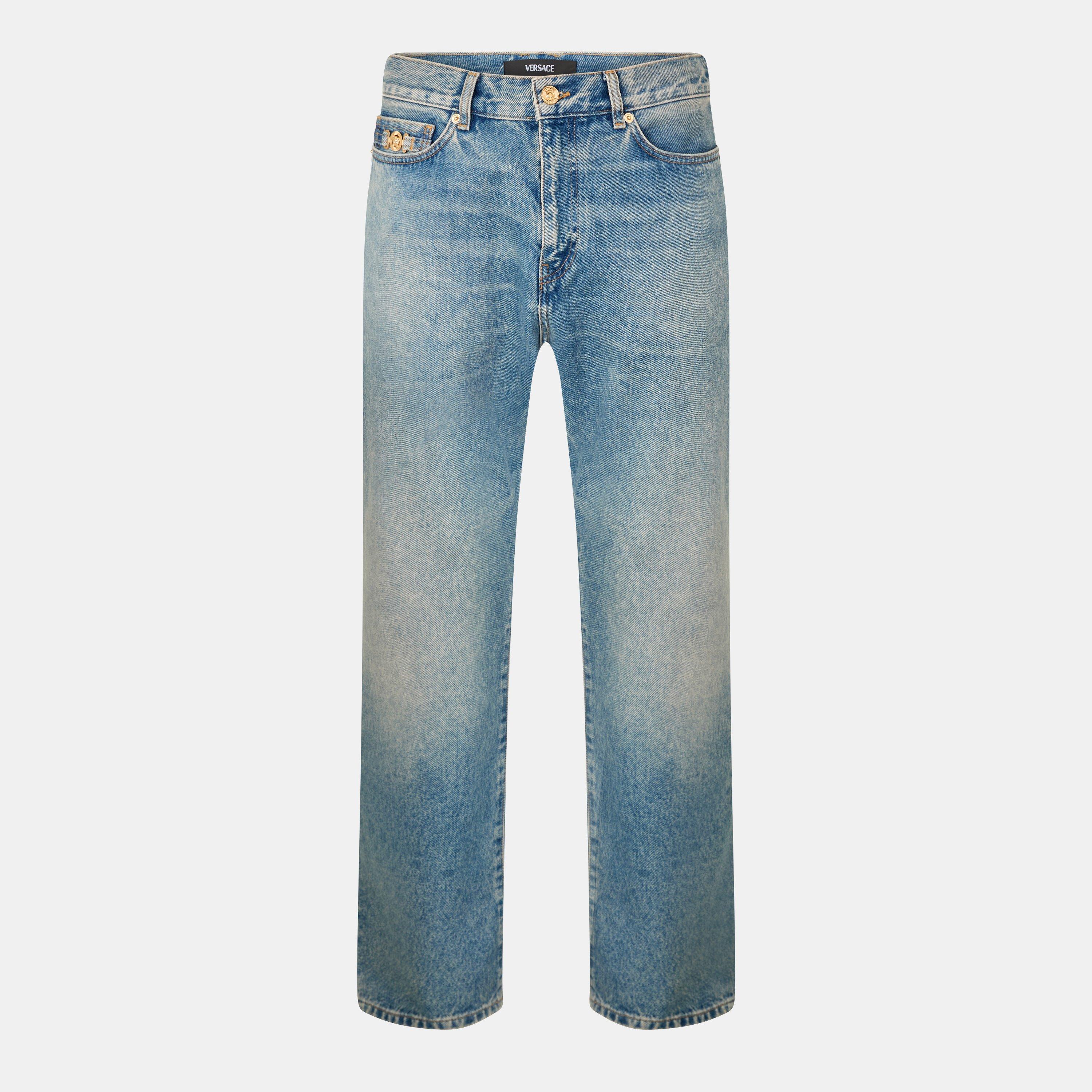Versace's straight jeans deliver Italian craftsmanship with a modern shape. Clean lines and precise detailing create an adaptable foundation piece that transitions smoothly from day to evening wear.