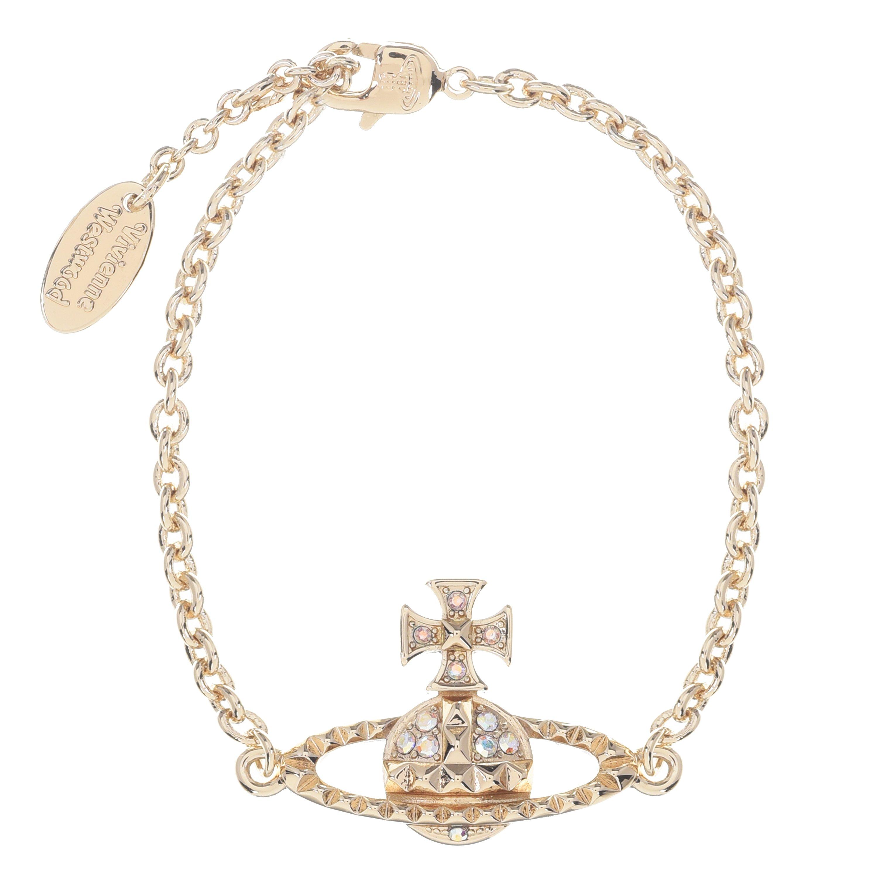 Bring luxe sophistication to your jewellery collection with the Mayfair Bas Relief Bracelet from Vivienne Westwood. Adroitly cast in durable brass and featuring an adjustable fine trace chain with a lobster claw clasp, this luxuriant piece is defined by a preciosa crystal embellished Saturn Orb charm- an iconic Vivienne Westwood motif that made it's first debut in 1986. Accompanied with luxury brand packaging and a protective dust bag. Dimensions: Adjustable chain length: 15.5 - 17.5cm. Weight: 8 grams.