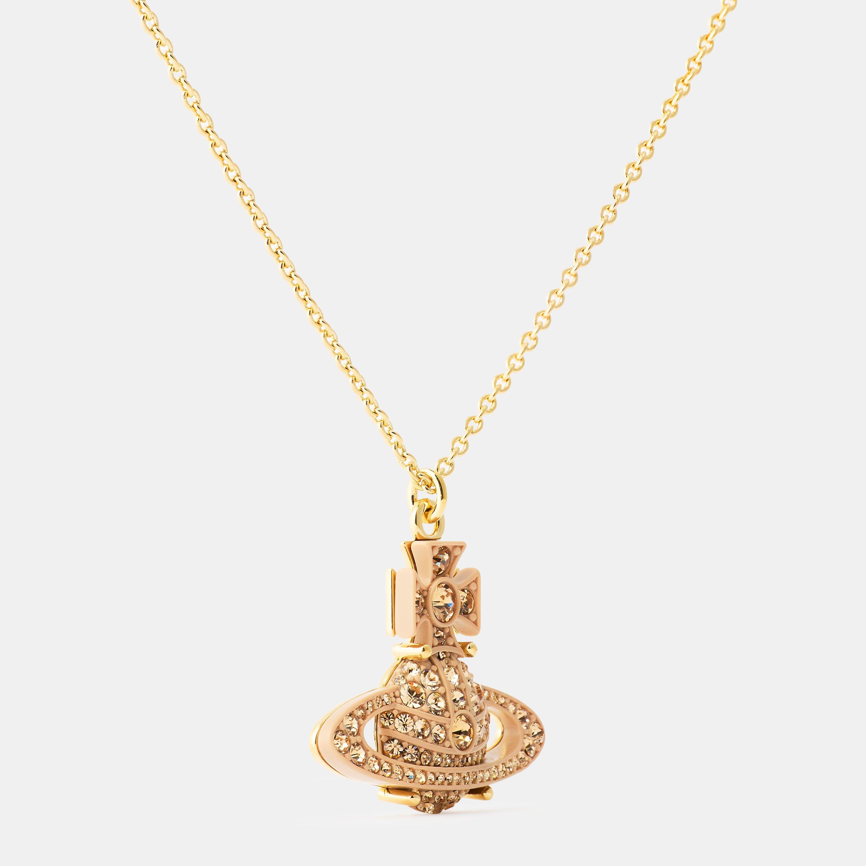 The Vivienne Westwood Pop Orb Pendant is a radiant statement piece crafted in gold-tone metal and adorned with sparkling crystal embellishments. Featuring the iconic Orb motif, it blends classic elegance with contemporary edge. Suspended from a delicate chain, it adds a touch of glamour to any ensemble. Perfect for evening occasions, date nights, or elevating everyday looks with shine.