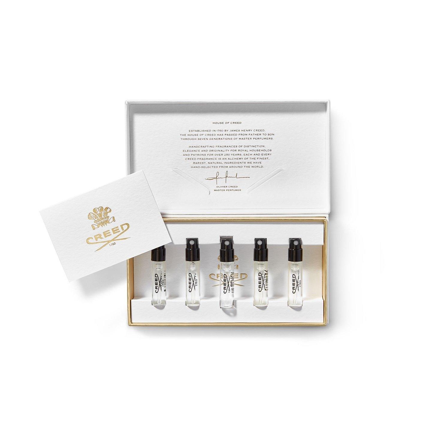Experience the artistry of seven generations of master perfumers with this luxurious discovery set from CREED. Presented in an elegant white and gold-trimmed box, this collection features five carefully curated fragrance samples that showcase the house's most distinguished creations. Dating back to 1760, this prestigious perfume house brings centuries of expertise to your personal fragrance journey. The set arrives in signature CREED packaging, complete with the iconic royal crest emblem, offering an exclusive glimpse into the world of haute parfumerie.