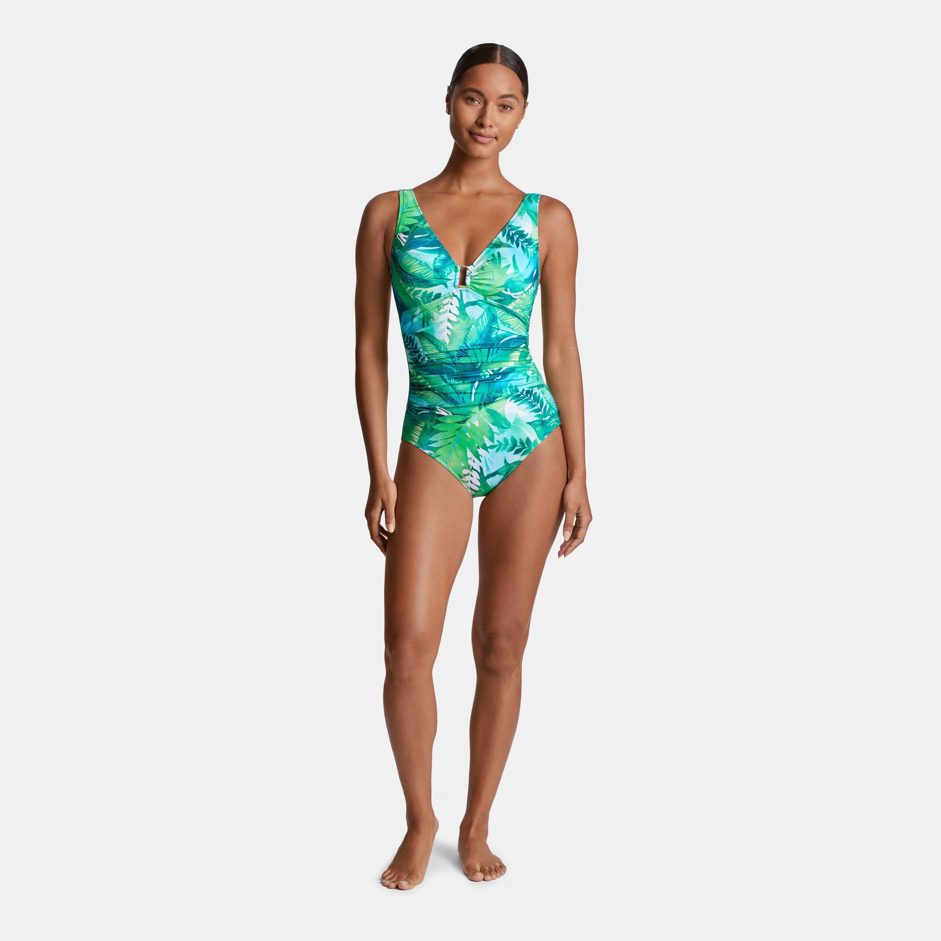 Timeless design meets modern detailing in this Lauren by Ralph Lauren swimsuit. Strategic ruching across the torso creates a figure-flattering silhouette, while the plunging neckline features an elegant ring detail that adds a contemporary touch. The deep V-neck and wide straps provide comfortable support for all-day wear, making this one-piece a perfect choice for poolside lounging or beach days.
