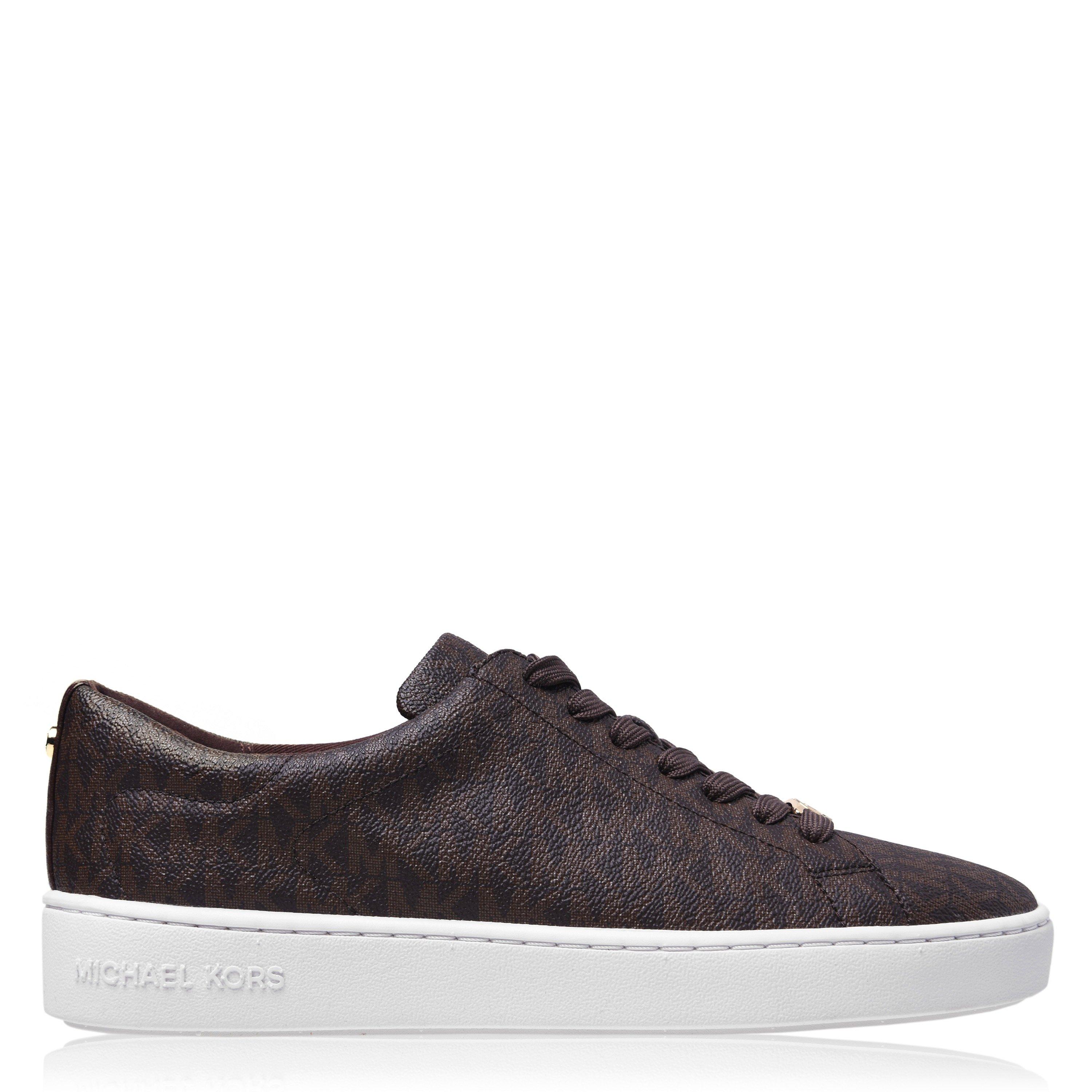 Distinctive monogram print defines these low-top trainers from MICHAEL Michael Kors. The signature canvas construction showcases the iconic MK pattern across the upper, while the clean lines and minimalist design make these trainers a versatile addition to any wardrobe. A durable rubber sole provides reliable traction, complemented by metal hardware details that add a touch of luxury to this casual footwear essential.