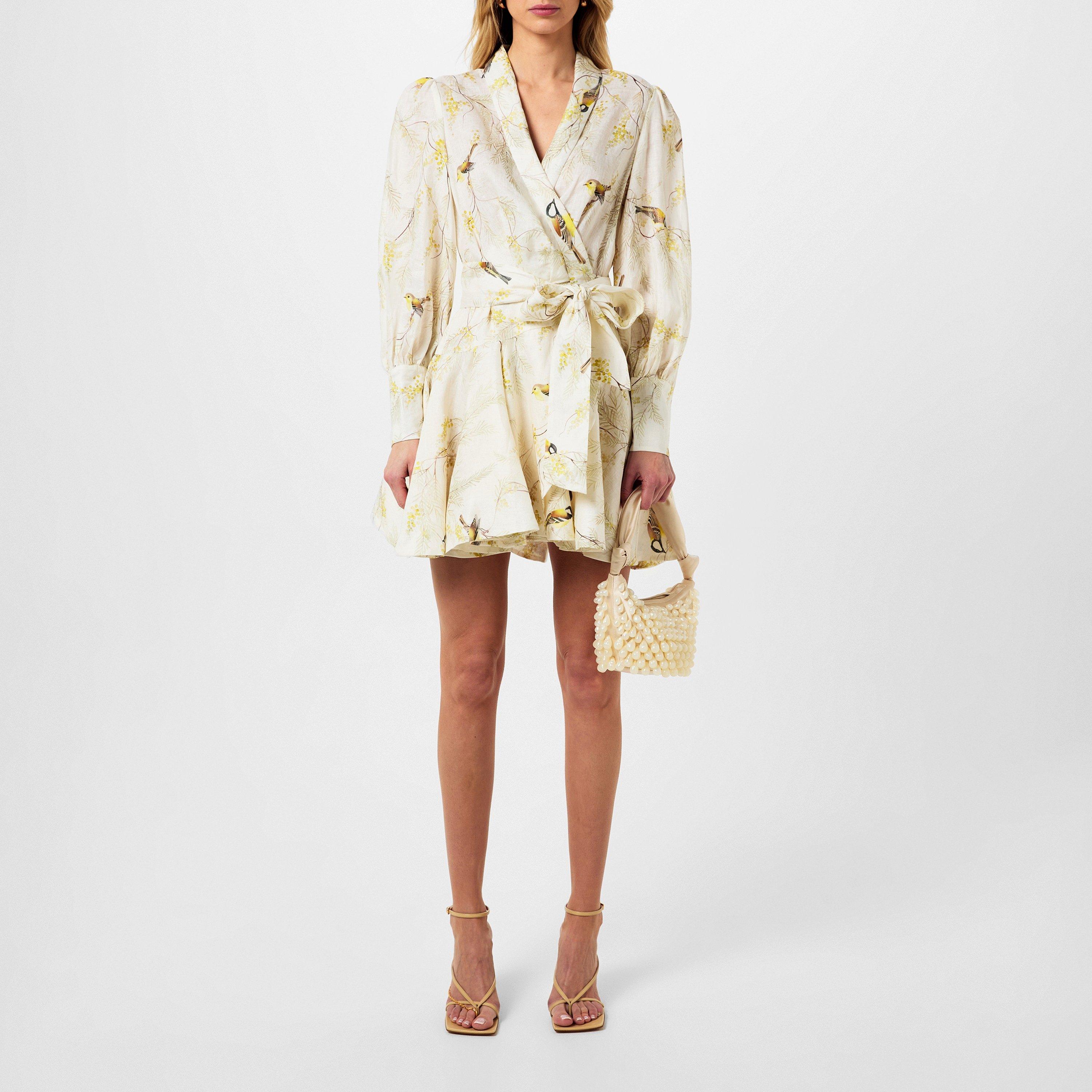 Step into the captivating world of Zimmermann with their exquisite Wrap Mini Dress in Acacia Birds from the Spring 2024 Collection.